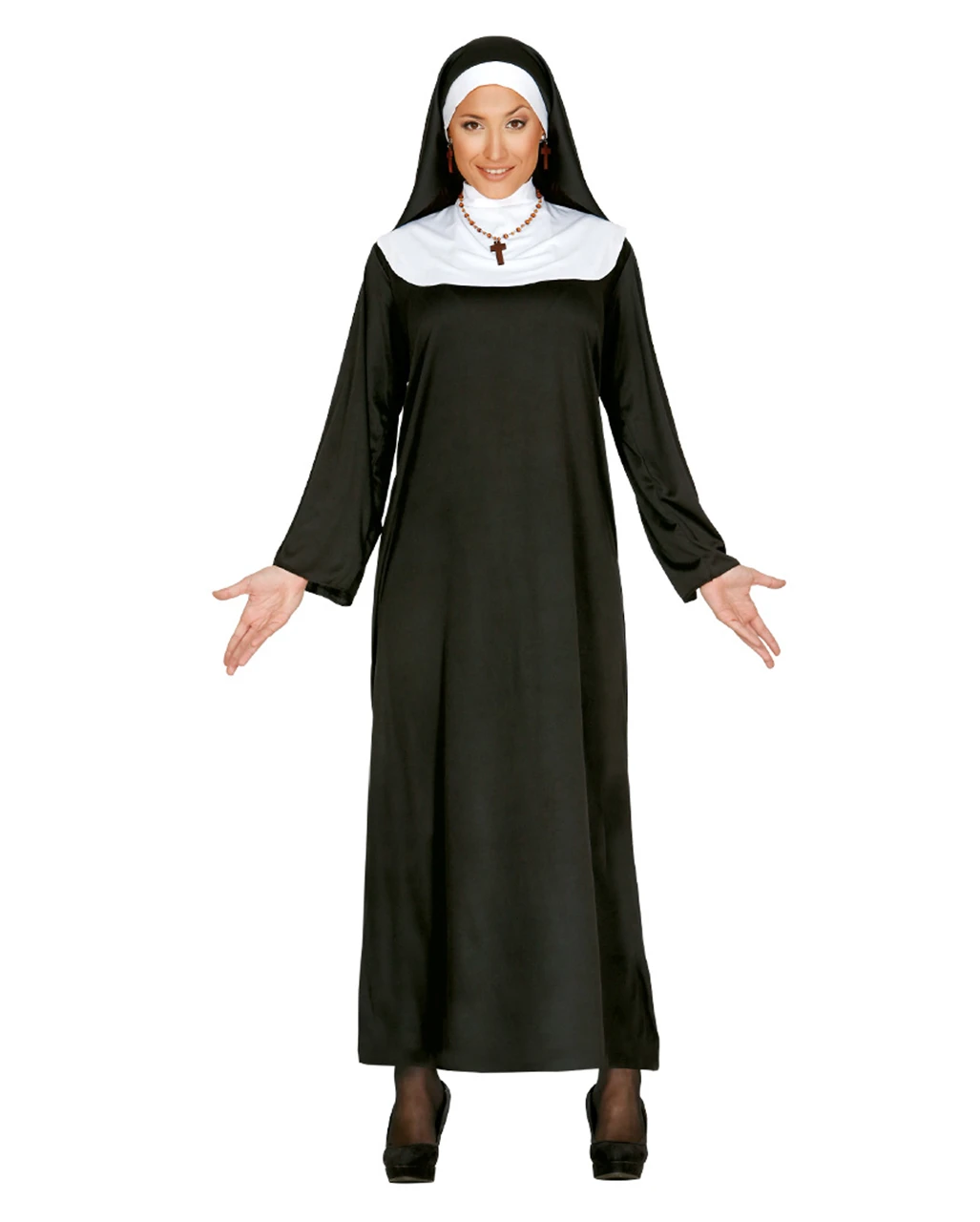 Das 2-tlg. Nonnen Kostüm besteht aus einer Robe und einem Schleier. Der Nonnen-Habit reicht bis zu den Knöcheln und entspricht optisch der klassischen Klosterschwestern-Kluft: hochgeschlossen, schwarz und mit einem weißen Kragen versehen. Der Schleier der Ordensschwester-Verkleidung ist ebenfalls in Schwarz gehalten, wird mit einem elastischen Zugband am Hinterkopf befestigt und zeigt ein weißes Stirnstück. Dazu passen die Rosenkranz Kette und Ohrringe Set und die Schwarze Netzstrumpfhose mit Kreuzen.