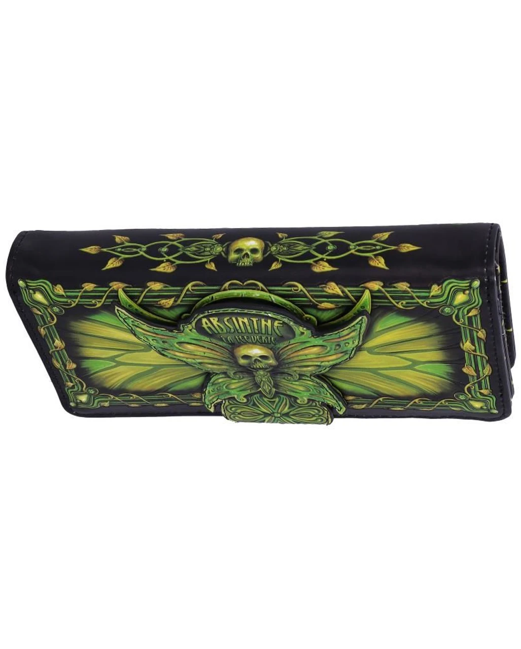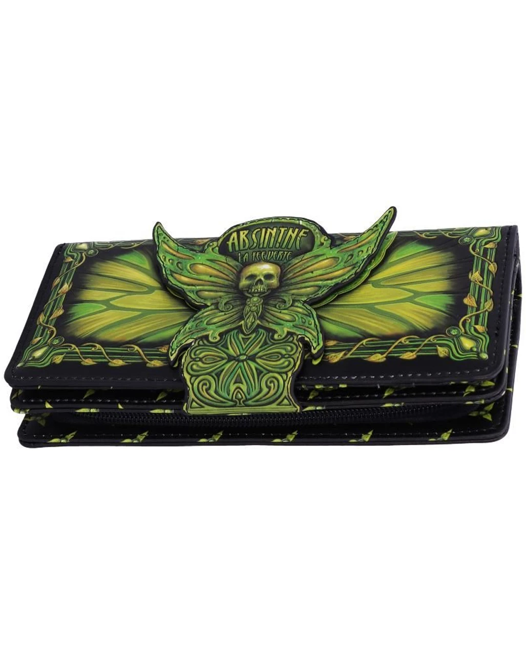 Der Absinthe Geldbeutel – La Fee Verte Grüne Fee besteht aus Kunstleder und ist ca. 18,5 cm groß. Das Absinthe Portemonnaie ist grün-gelb-schwarz gehalten und mit einem Totenkopf-Geist auf der Vorderseite geprägt. Es bietet Platz für Kreditkarten, Scheine und Münzgeld. Bestelle das Gothic Accessoire hier online und am besten die Grave Digger Totenschädel Handtasche KILLSTAR gleich dazu.