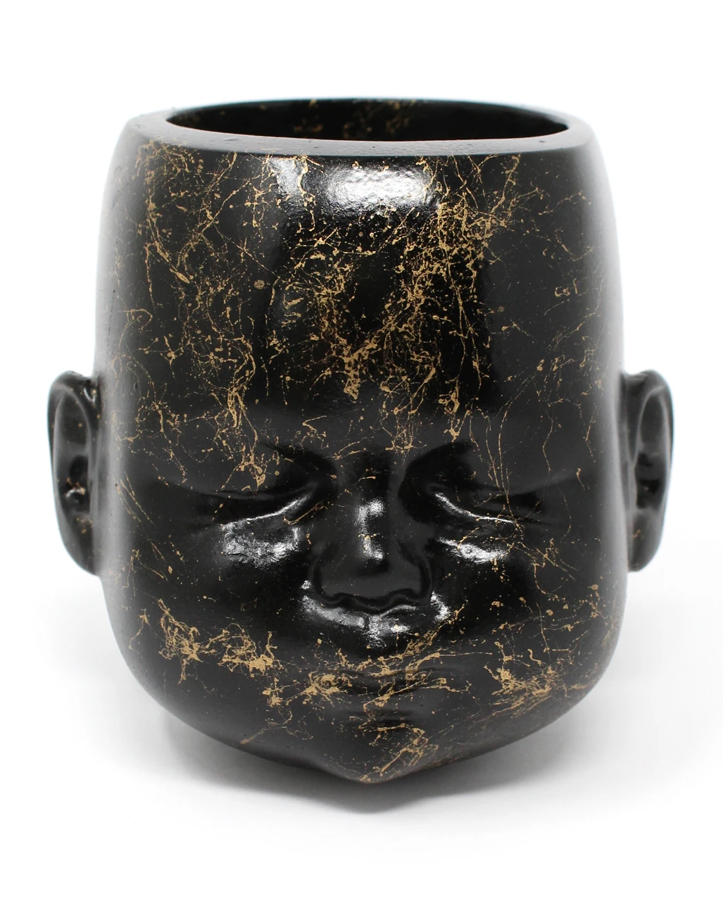 Der Baby-Puppenkopf Blumentopf dekoriert deine Gruft mit eleganten Highlights. Unser schwarz-goldener Gothic Pflanzenkübel bietet Sukkulenten und Kakteen ein außergewöhnliches Zuhause. Als Puppenschädel Blumentopf sorgt er für einen echten Hingucker und setzt deine Pflanzen super in Szene. Platziere den Pflanzkübel auf dem Esstisch, deinem Wicca-Altar oder auf dem Schreibtisch und setze schöne Akzente. Neben Zimmerpflanzen lässt sich der Blumentopf auch für Schminkpinsel oder sonstigen Krimskrams nutzen. Dieser Blumenkübel stammt aus dem Hause The Blackened Teeth UK – deiner Marke für abgefahrene Gothic Wohnaccessoires.