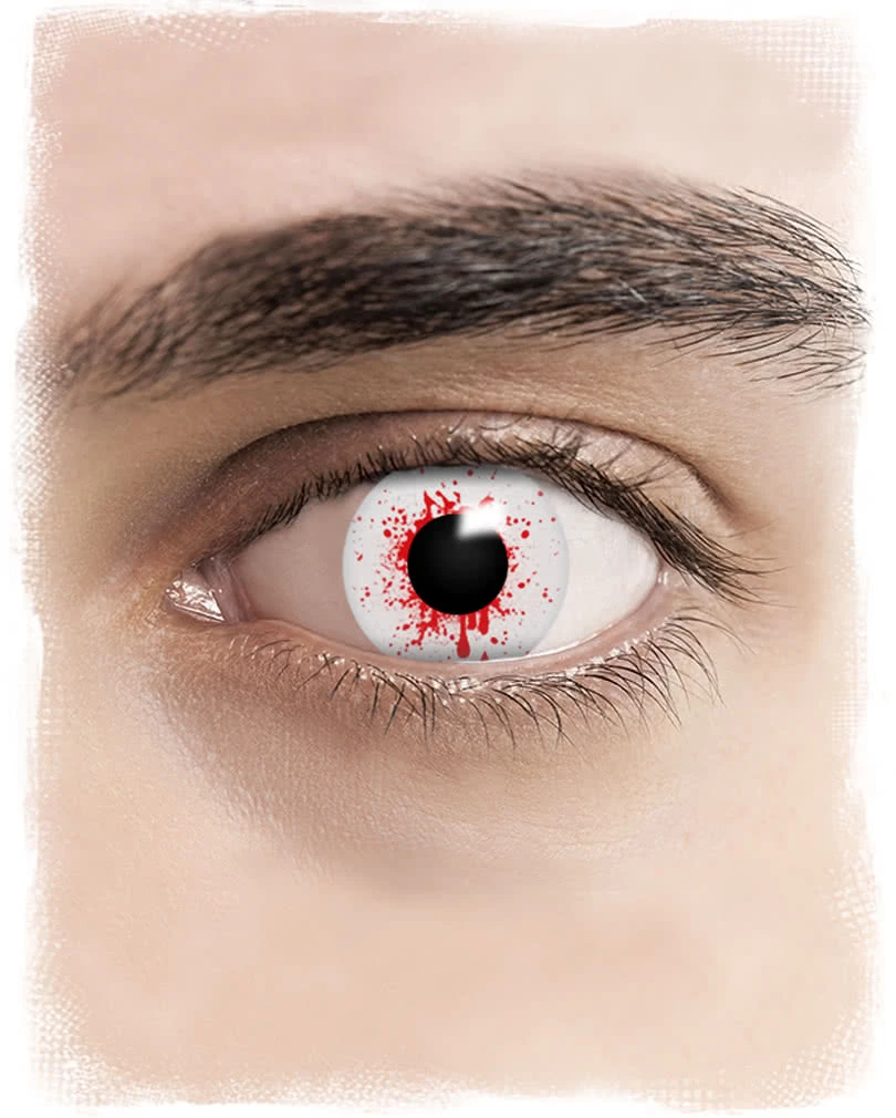 Weiße Kontaktlinsen die viele Blutspritzer als Motiv aufweisen sind der Hit für Halloween oder den Zombie Walk. Mit den krassen Zombie Kontaktlinsen kannst du als infizierter Zombie verkleidet gehen oder einen blutrünstigen Serienmörder darstellen. Die weißen Motivlinsen mit Blutspritzern verleihen dir dabei den notwendigen mörderischen Blick. Gruselige Effektlinsen sind ein Muss für Special Make Up und profesionelles Auftreten als Schauspieler, der ein Monster darstellen will.