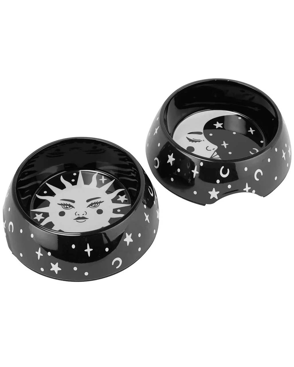 Die Cosmic Futternäpfe von KILLSTAR kommen mit kontrastreichem Sonne-Mond-Sterne-Druck in Schwarzweiß. Du erhältst zwei Futternäpfe, die jeweils ca. 4 cm hoch sind. Die KILLSTAR Tierfutternäpfe bestehen aus Kunststoff und sollten am besten per Hand gereinigt werden. Entdecke noch mehr Gothic Haustierbedarf wie die Drachen Baby Tierhöhle KILLSTAR.