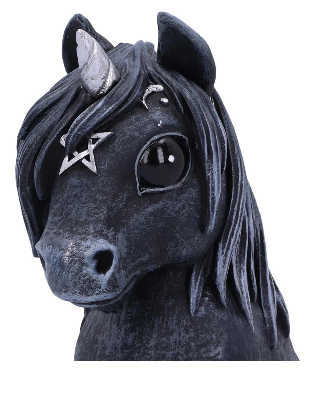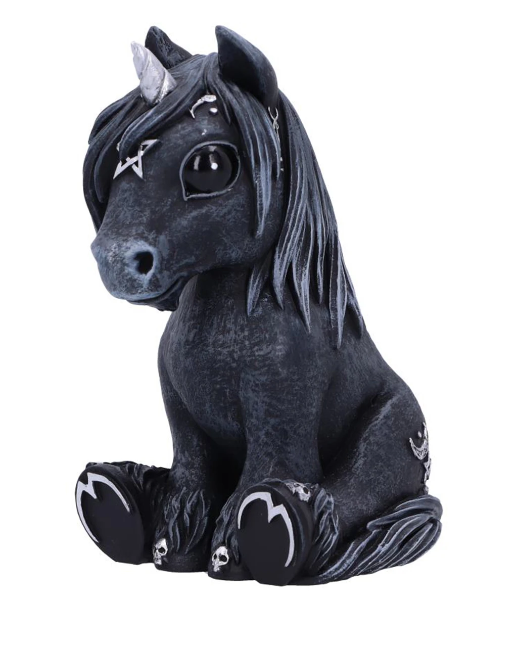 Dass Unicorns nicht immer knallbunt sein müssen, beweist diese nieldiche Culticorn Cult Cutie Figur! Das schwarze Einhorn ist ein ganz außergewöhnliches Exemplar aus der Reihe der Cult Cuties. Ganz im Gothic Style kommt das okkulte Pferdchen mit Pentagramm und Totenschädel Symbolen daher. An graziler Ausstrahlung verliert es dadurch aber keinesfalls. Die Einhorn Statue blickt dich mit großen, schwarzen Augen an und schaut in deine Seele. Als Deko-Highlight in deiner Figurensammlung macht es sich ebenso gut wie als dekoratives Einzelstück.