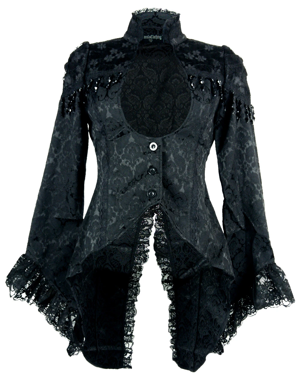 Mit einem solchen Damen Brokatfrack mit Spitze kannst du extravagante Gothic Outfits aufpeppen. Die gemusterte Frauenjacke im Gothic Look ist reich verziert und ein echter Hingucker auf Gothic Festivals, Fotoshootings und zu Halloween.