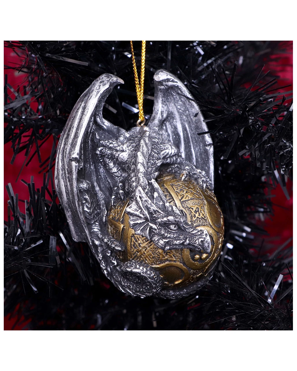 Unsere Drache mit Keltenmuster Christbaumkugel klammert sich an eine wunderschön gearbeitete Goldkugel. Mit komplexen Tribals verziert und zentriert durch ein keltisches Kreuz, ist das Gothic Ornament eine festliche Weihnachtskugel. Unser Drachen Weihnachtsschmuck eignet sich aber genauso als ganzjährige, außergewöhnliche Fantasy-Deko.