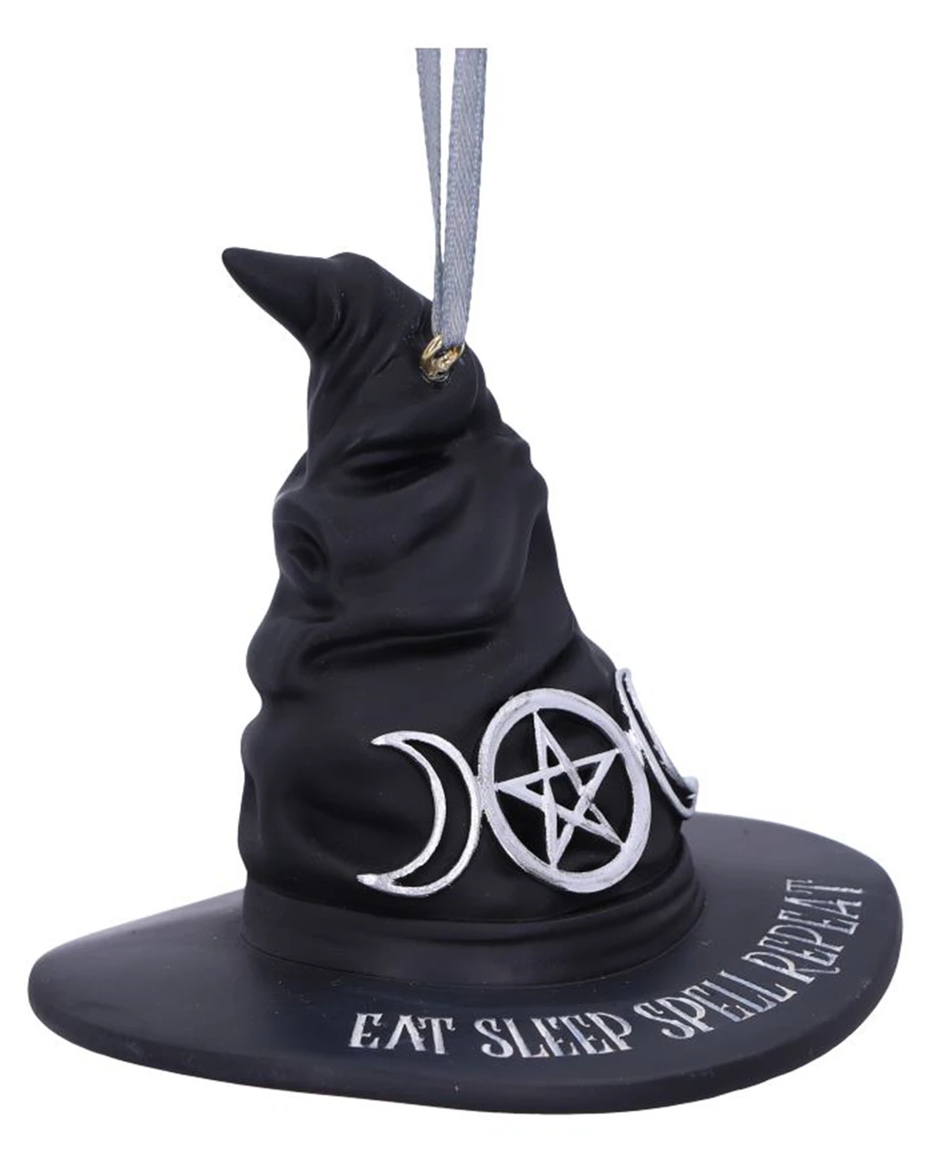 Mit dem Eat Sleep Spell Repeat Hängedeko Ornament bringst du Magie in deine Einrichtung. Als bezauberndes Deko Accessoire kannst du den magischen Hut als Hingucker an den Weihnachtsbaum hängen. Natürlich ist unser Hexenheut aber auch an Halloween oder in der Walpurgisnacht eine gute Gelegenheit, um deine okkulte Seite. Schließlich beweist du beim Dekorieren ein echt magisches Händchen.
