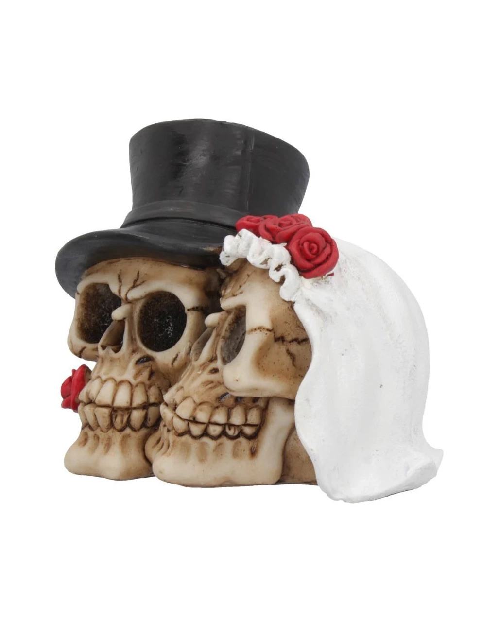 Unser Totenschädel Brautpaar aus Kunststein zeigt den Totenkopf der Braut mit Schleier und den Schädel des Bräutigams, der einen Zylinder trägt. In seinem Kiefer steckt eine rote Rose, die ebenso unvergänglich ist wie die Liebe der beiden. Noch mehr alternative Geschenkideen für Hochzeit und Co. findest du in unserem Onlineshop. Hier wartet auch das Deko Brautpaar Skelett 3er Set als Hochzeitsdeko für Gothics!