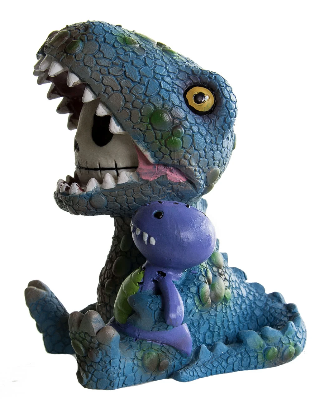 Die große Furrybones Figur – Rex ist ca. 10 cm hoch, 7 cm breit & 8 cm tief & besteht aus Polyresin, einem stabilen Kunststein. Die Dino-Figur ist mit viel Liebe zum Detail verarbeitet & handbemalt. Es sieht aus, als würde eine Skelett ähnliche Figur in das innere des Tyrannosaurus geschlüpft sein, grinst frech heraus & hat ein lila-grünes Dinosaurier-Kuscheltier im Arm. Die Furrybones Figuren sind eine geniale Geschenkidee für Gothic & Dinosaurier Fans.
