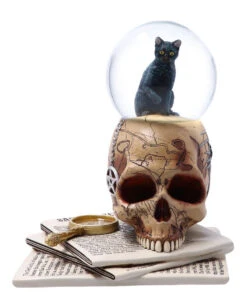 Die beeindruckende „Geister von Salem“ Schneekugel stammt aus den magischen Gedanken der Fantasy-Künstlerin Lisa Parker. Als Verkörperung des wahren Geistes von Salem sitzt eine schwarze Katze auf einem gealterten Hexen Schädel. Die Schnitzerei im Schädel zeigen eine echte Karte von Salem aus der Zeit der grausamen Hexenprozesse, was dieses Stück noch bedeutungsvoller macht, als es zunächst scheint. Unter dem Totenschädel befindet sich ein Stapel alter Zeitungen, in denen die Schrecken der Prozesse geschildert werden.