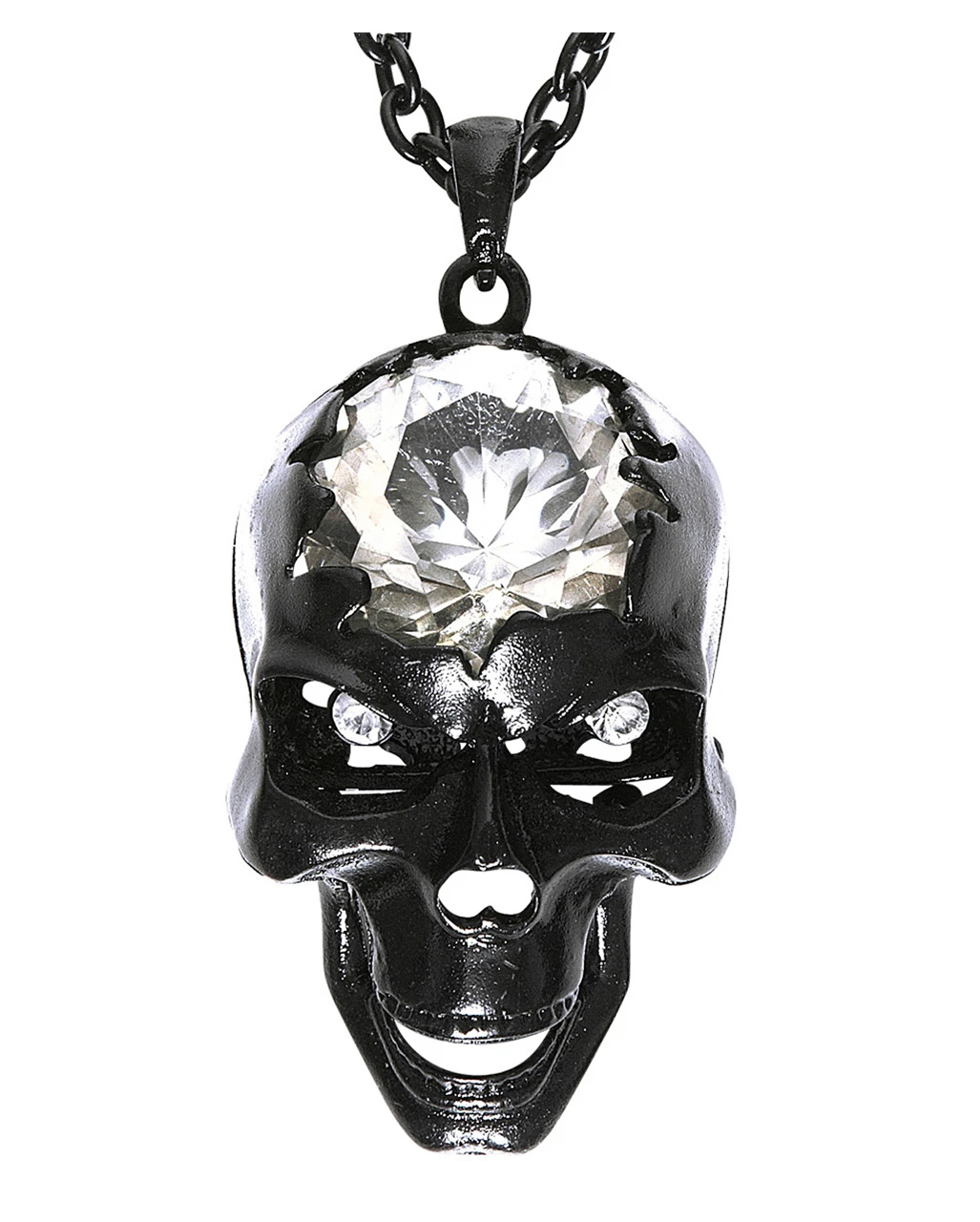 Der Anhänger der ca. 72 cm langen,schwarzen Kette stellt einen schwarzen Totenkopf mit beweglichem Kiefer und zwei kleinen Strasssteinen als Augen dar. Der obere Teil des Totenschädels sieht aus, als wäre ein Stück herausgebrochen und darunter schaut ein großer Strassstein hervor. Die Gothic Halskette mit Totenkopf passt perfekt zu dem Skelett Ballett Kostüm oder dem Skelett Skinsuit schwarz.