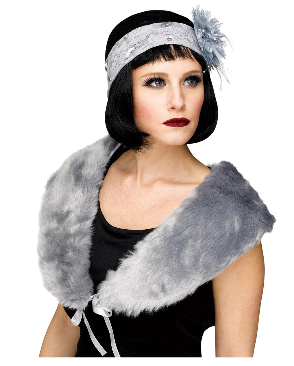 Die graue 20er Jahre Flapper Stola besticht durch ihr schönes Design. In Felloptik gehalten, passt sie perfekt zu sämtlichen Kostümen im 20s Style. Die Charleston-Stola wird einfach über die Schultern gelegt und vorne mittels eines silbernen Bandes zugeschnürt. Dazu passen der Schwarze Zigarettenspitze und die Satin Handschuhe schwarz.