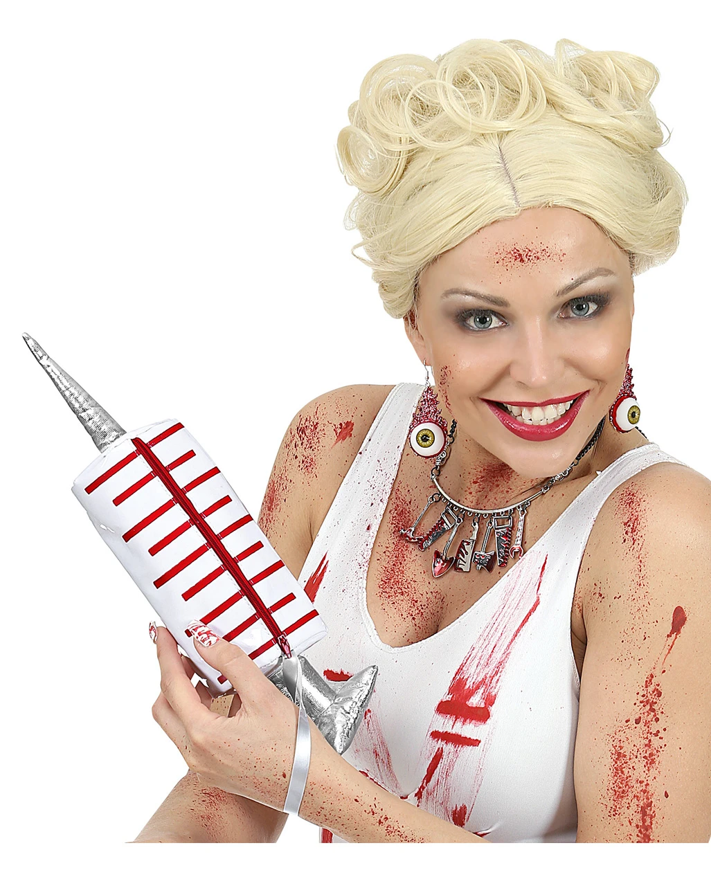 Damit du deine Patienten auch unterwegs versorgen kannst, bekommst du zu deinem Krankenschwester Kostüm diese geniale Große Spritzen Handtasche! Mit dem Nurse Kostümzubehör bleibst du auch in der jecken Menge stets in deinem Charakter und musst keine schwere Handtasche mit dir herumtragen. Eine kleine Schlaufe ermöglicht dir den mühelosen Transport! Auch für Zombie Verkleidungen macht sich die blutige Krankenschwester Handtasche für Halloween & Zombie Walk ganz hervorragend!