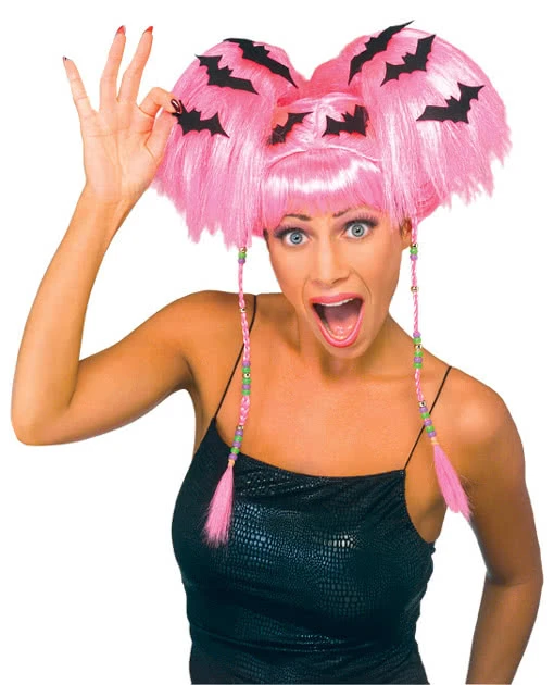 Lustige, pinkfarbene Neon Perücke mit Fledermäusen als Verzierung