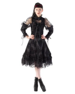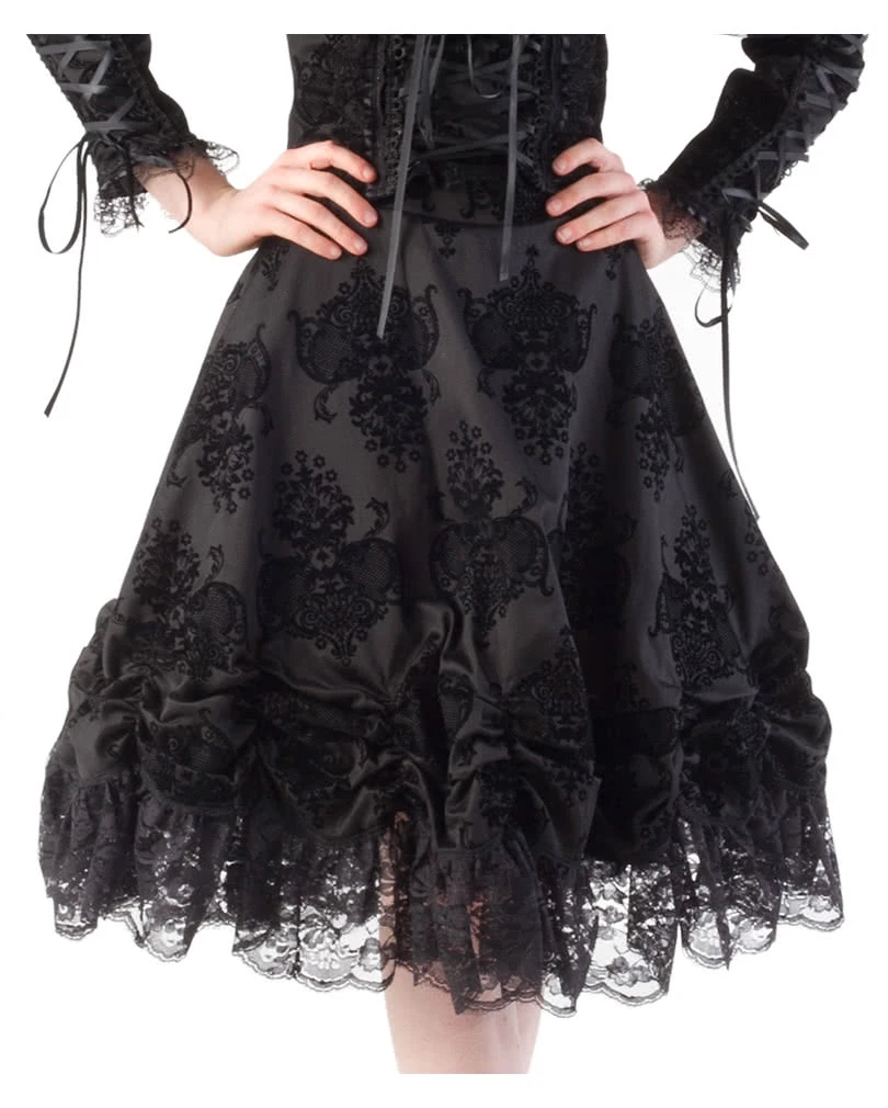 Der weite Spitzenrock überzeugt durch den Flockdruck im Barockstil, sowie der elegant auslaufenden Raffung am Saum und der schwarzen Spitze. Der Hohe Bund ist perfekt für Kombinationen mit Bluse und Unterbrustkorsett. Auf der Rückseite befindet sich ein Reißverschluss. Neben dem einzigartigen Spitzenrock findest du noch die Gothic Damenhose Kiara und das Viktorianisches Trägerkleid.