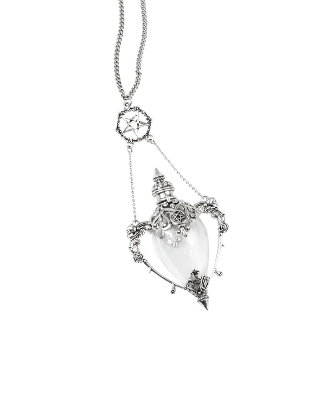 Die Kuss des Todes Fläschchen Halskette KILLSTAR ist ein echter Hingucker. Die lange silberne Gothic Kette besticht durch einen extravaganten Anhänger, der ein transparentes Fläschchen als Herzstück hat. Der Anhänger ist reichlich mit floralen Mustern verziert und als weiteres Highlight befindet sich oberhalb des Fläschchens ein weiteres Element. Ein silbernes Pentagramm lässt darauf schließen, dass du vielleicht doch einen Zaubertrank in deinem Gothic Halsschmuck verborgen trägst.