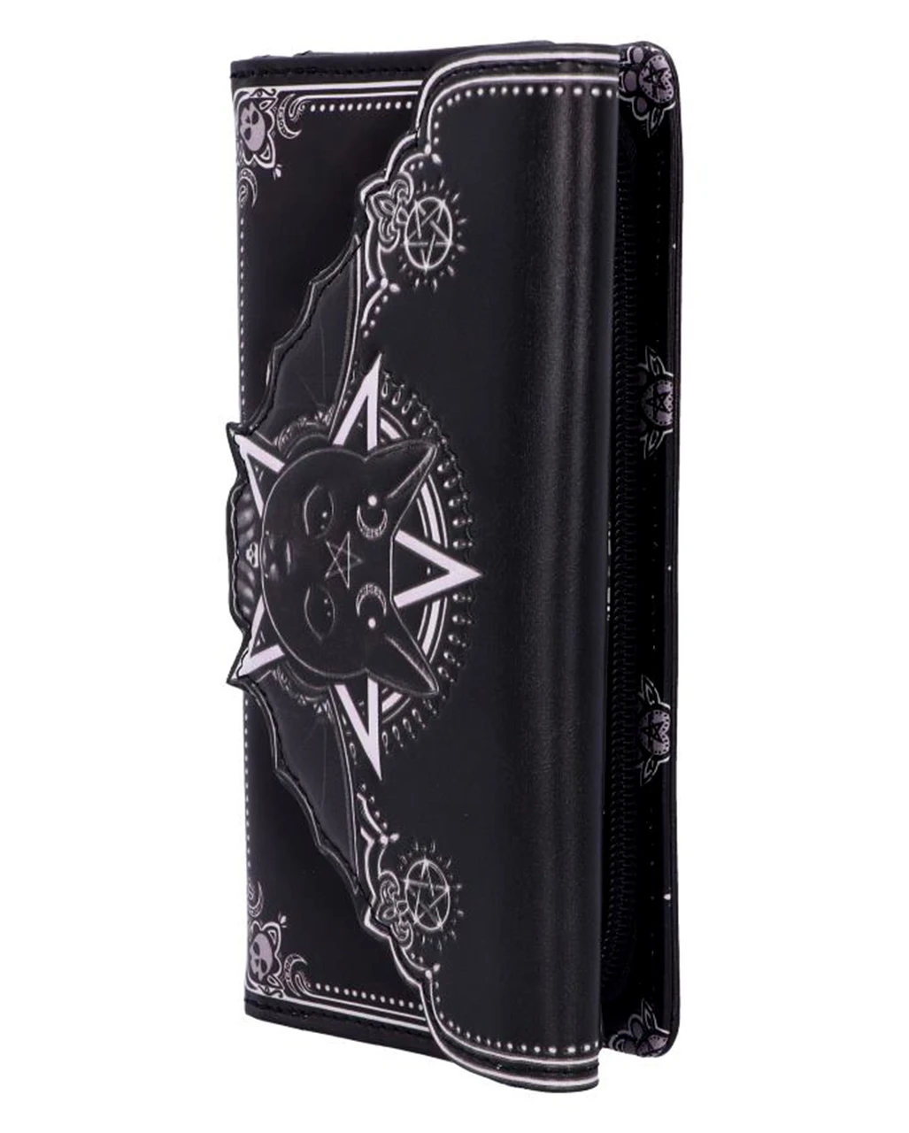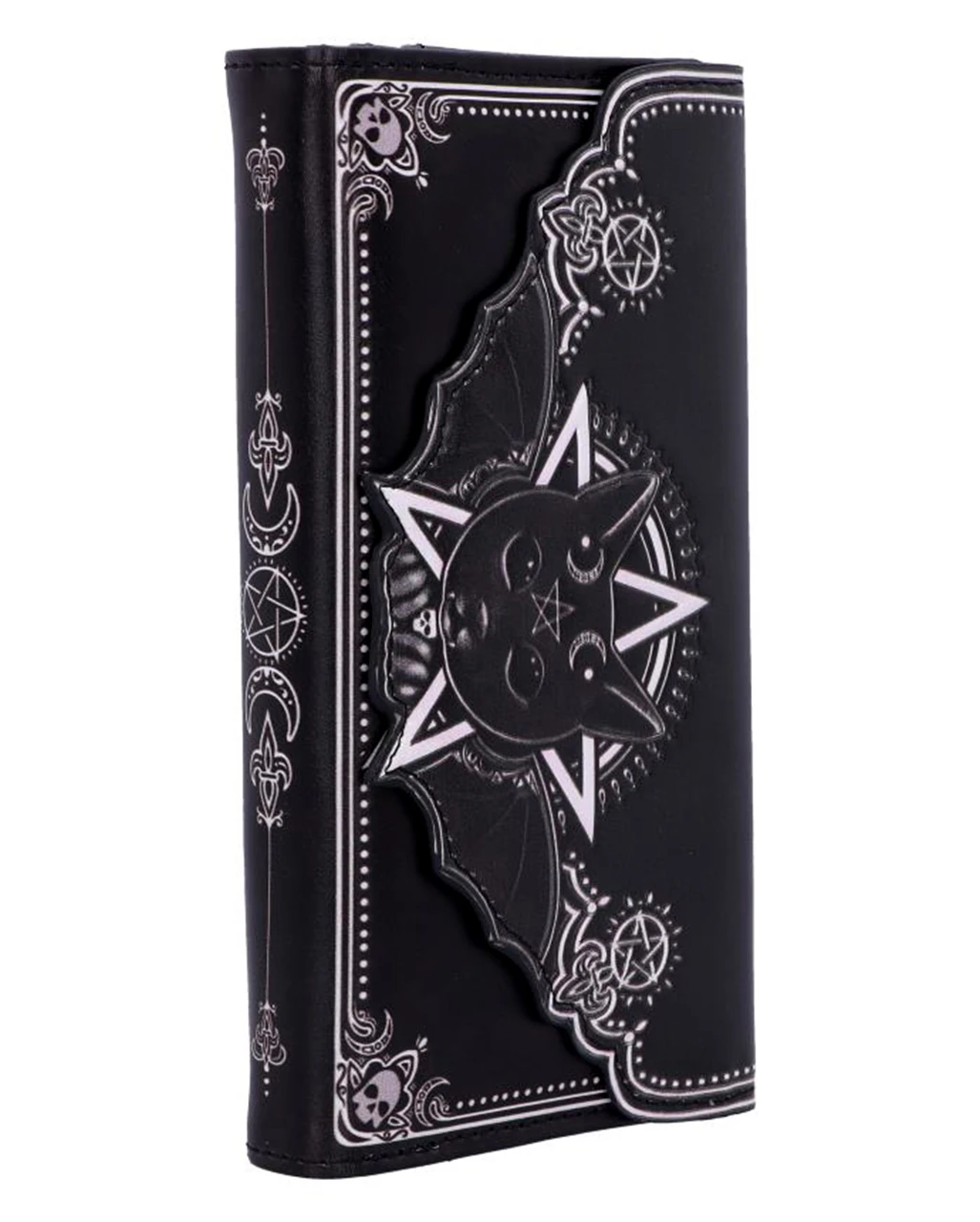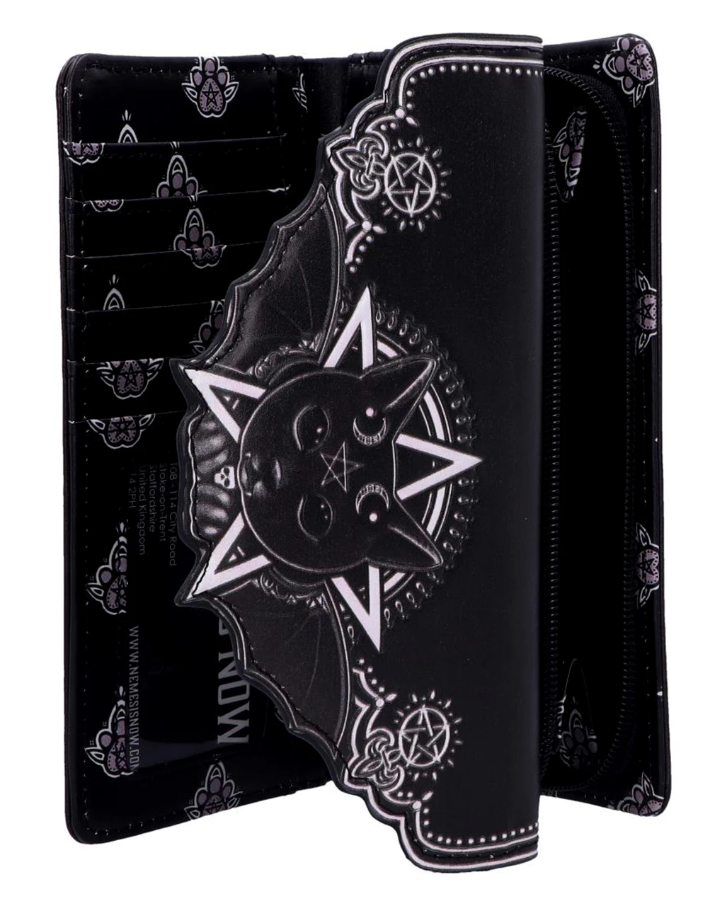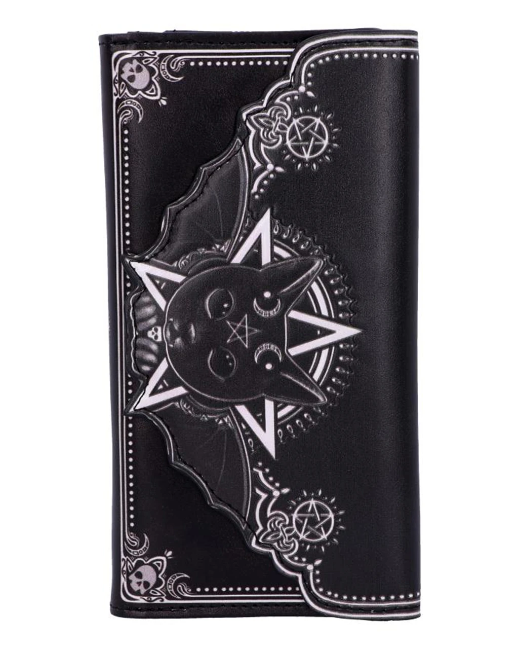 Unser geprägter Malpuss Kult Cutie Geldbeutel ist das ideale Accessoire für deinen Auftritt als Königin der Nacht. Du bist von Kopf bis Fuß auf Dunkelheit eingestellt. Das zeigst du in deinen perfekt abgestimmten Details wie dem Gothic Portemonnaie mit der niedlichen Vampir Katze. Ein Vampirgeist, der durch Fledermausflügel, die aus dem Rücken der Katze herausragen, symbolisiert wird, scheint in der Mieze zu wohnen. Damit hat sie dein dunkles Herz erobert und macht die Geldbörse zum Lieblings Accessoire auf deinen nächtlichen Streifzügen.