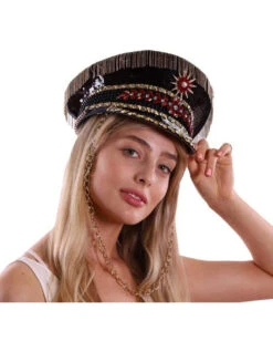 Du suchst eine außergewöhnliche Kopfbedeckung für Parade-Kostüme? Dann wirst du mit dieser außergewöhnlichen Militär Pailletten Schirmmütze in Schwarz fündig: Die Mütze im Marching-Band-Style ist mit Glassteinen und Pailletten designt. Das perfekte Kostümzubehör für Fracks und Parade-Outfits.