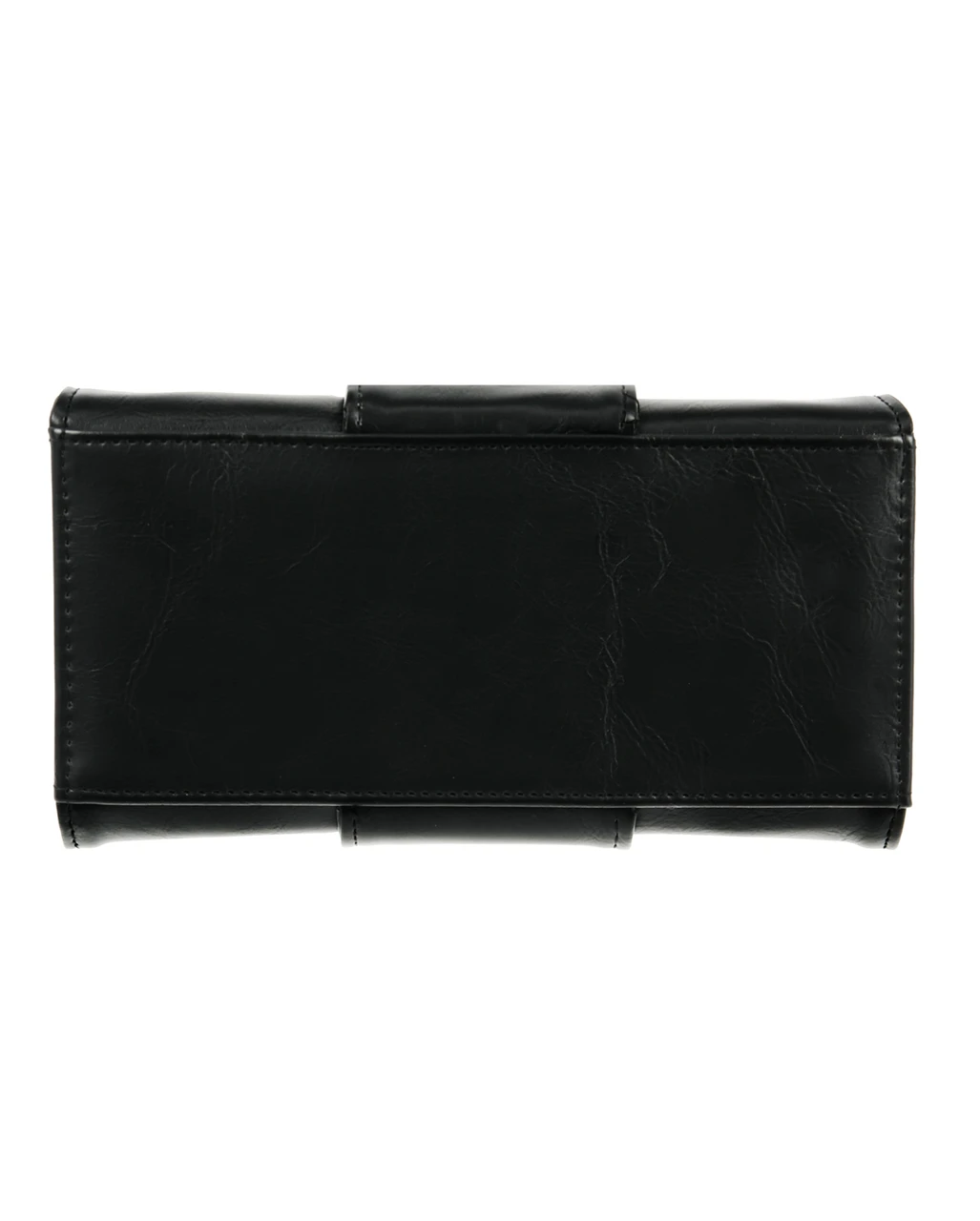 Der Moon Gothic Geldbeutel mit Fledermausflügel ist schwarz und aus robustem Kunstleder gefertigt. Mittels Druckknopf lässt sich das Gothic Portemonnaie öffnen. Dein Portemonnaie verfügt über drei Hauptfächer für Geldscheine sowie ein Reißverschlussfach für Münzen. Auch Visitenkarten finden hier einen Platz. Bewahre deine Moon Gothic Purse mit Fledermausflügel in unserer Never Trust the Living Handtasche KILLSTAR auf.