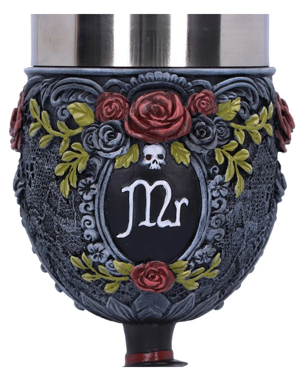 Romantischer Gothic Kelch als Trinkgefäß für deine morbid, romantische Gothic-Hochzeit. Als Stiel des Mr Gothic Kelch trägt das männliche Skelett einen schicken Anzug und einen schwarzen Zylinderhut. Der Kelch ist mit verschnörkelten Mustern und Rosen verziert, und in der Mitte steht ein „Mr.“. Die Basis ist in romantischer Herzform geformt und bietet einen guten Stand.