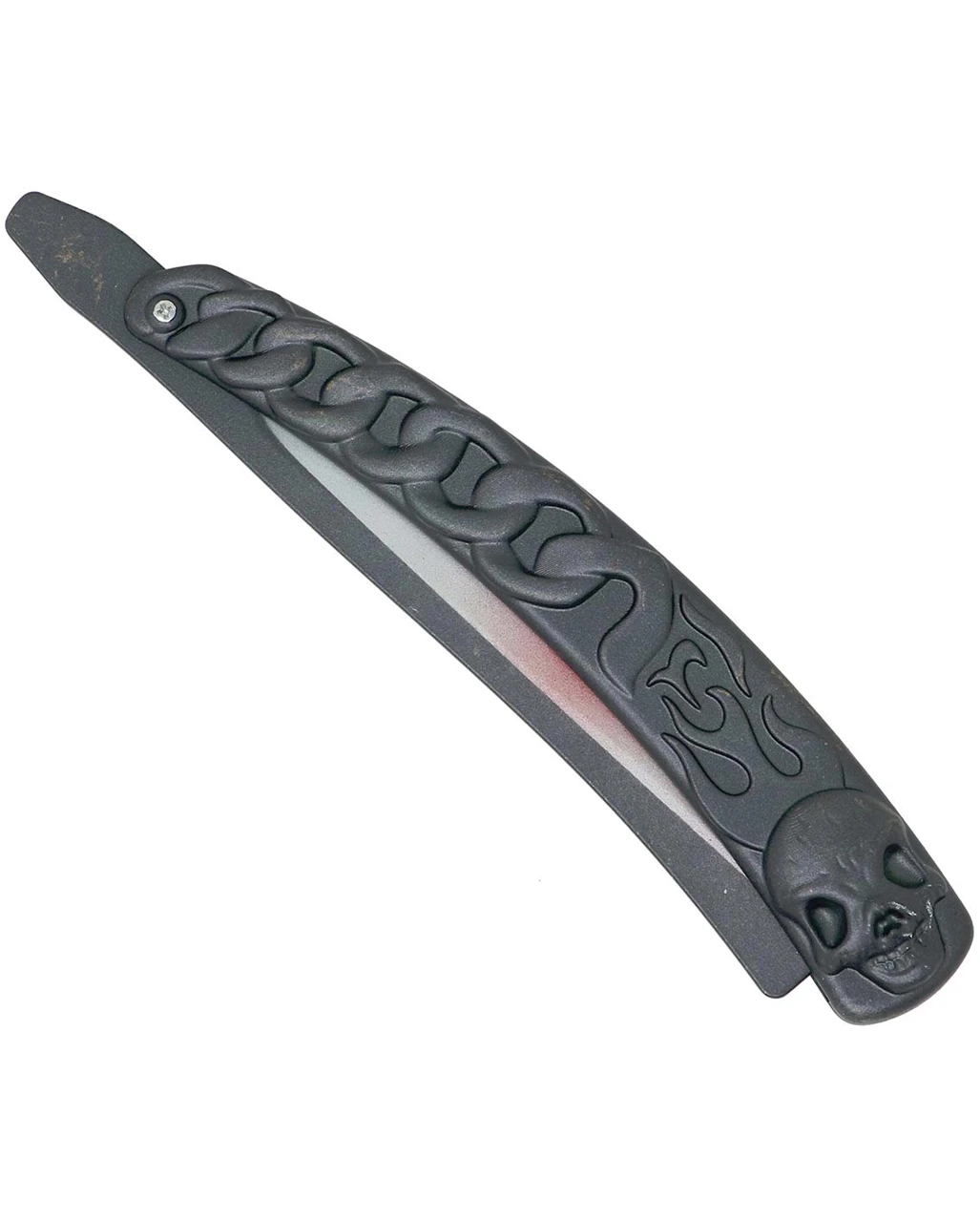 Hol dir das Rasiermesser blutig, wenn du für dein Killer Kostüm eine eindrucksvolle Spielzeugwaffe suchst. Du kannst mit dem Kunststoff Messer in verschiedenste Rollen schlüpfen. Das Messer selbst wirft erst einmal einige Fragen auf. Also bist du entweder der schlechteste Barbier der Welt oder du führst Schreckliches im Schilde. Natürlich hält dir das Halloween Rasiermesser auch nervige Zombies oder Fake Gangster vom Leib. Einfach die Spielzeugwaffe zücken und du hast deine Ruhe.