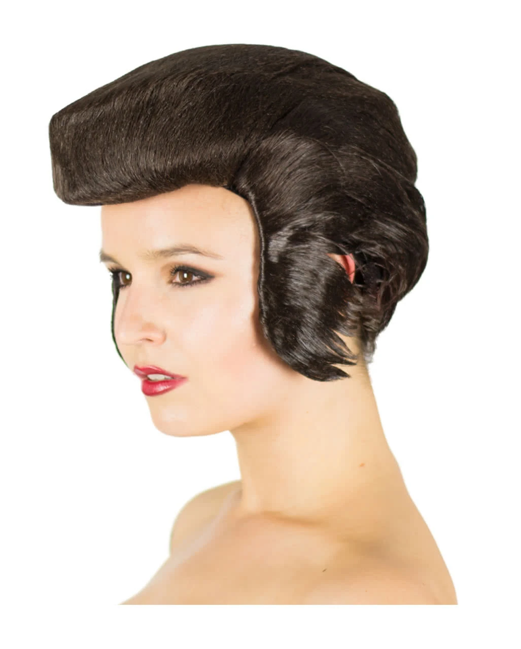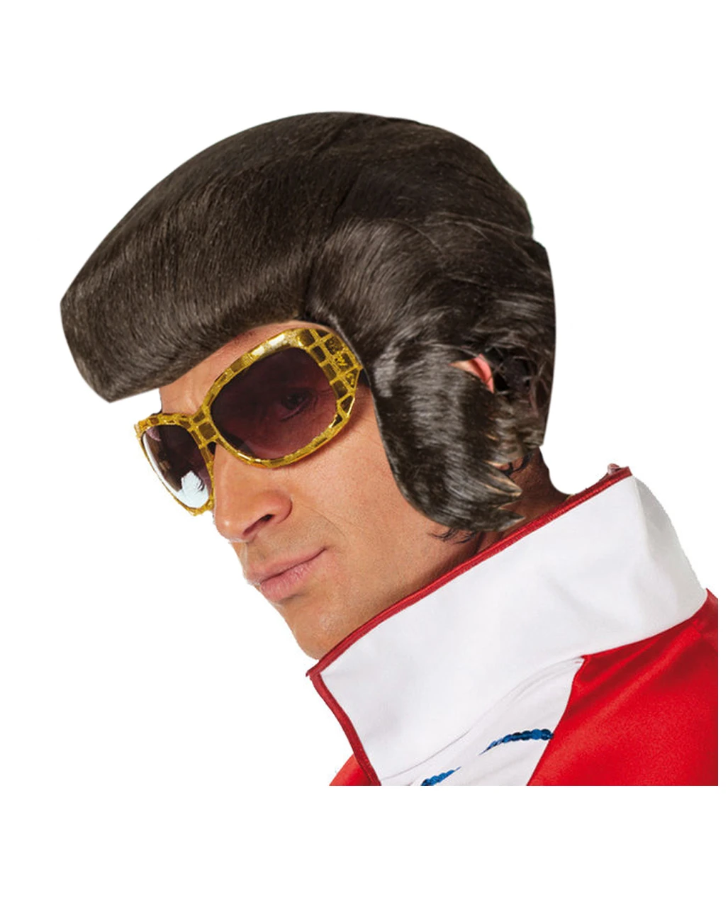 Die braune Rock King Perücke entspricht in Form und Design dem Stil der Rock Ikonen aus den 60er Jahren. Die künstlichen Haare wirken streng nach hinten gegelt und vorne sind sie zu einer charakteristischen Tolle aufgetürmt. Zwei beeindruckende, seitlich angebrachte Koteletten vervollständigen den rockigen Look. Ein innen eingearbeitetes Netz sorgt dafür, dass die Faschingsperücke angenehm und ohne störendes Jucken zu tragen ist. Dazu passen das Elvis Presley Verkleidung und das Mikrophon Attrappe.
