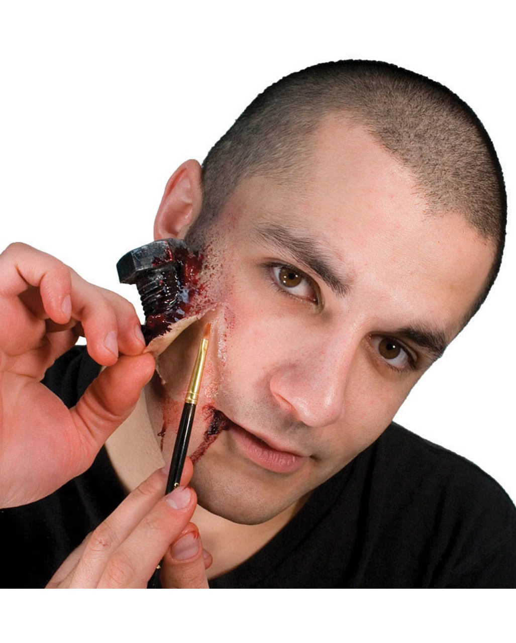 Der Schmink Pinsel hat einen Holzschaft, die Borsten aus weichem Nylon sind mit einer messingfarbenen Metallhülse am Schaft befestigt. Mit einem Profi Schminkpinsel lässt sich unser Gothic Make Up Stack oder Unfall Make Up / Injury Stack Make Up kinderleicht auftragen und auch feinste Kontoren sauber ausarbeiten.