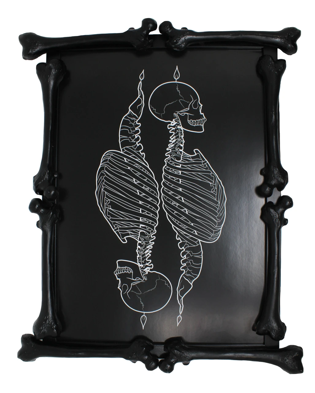 Unser schwarzer Knochen-Bilderrahmen kommt im A4-Format und ist sowohl im Hochkant- als auch im Querformat nutzbar. Der Gothic Fotorahmen verfügt über einen edlen Glanz und setzt Bilder, Fotos und deine eignen Kunstwerke stilvoll in Szene. Die Rahmen sind mit 2 mm starkem Plexiglas ausgestattet, das dein Kunstwerk vor Staub und Verschmutzung schützt. Diese Gothic Wanddekoration stammt aus dem Hause The Blackened Teeth UK, die für ihre extravaganten Gothic Wohnaccessoires gefeiert werden. In unserem Shop entdeckst du außerdem: Sensenmann Wanduhr