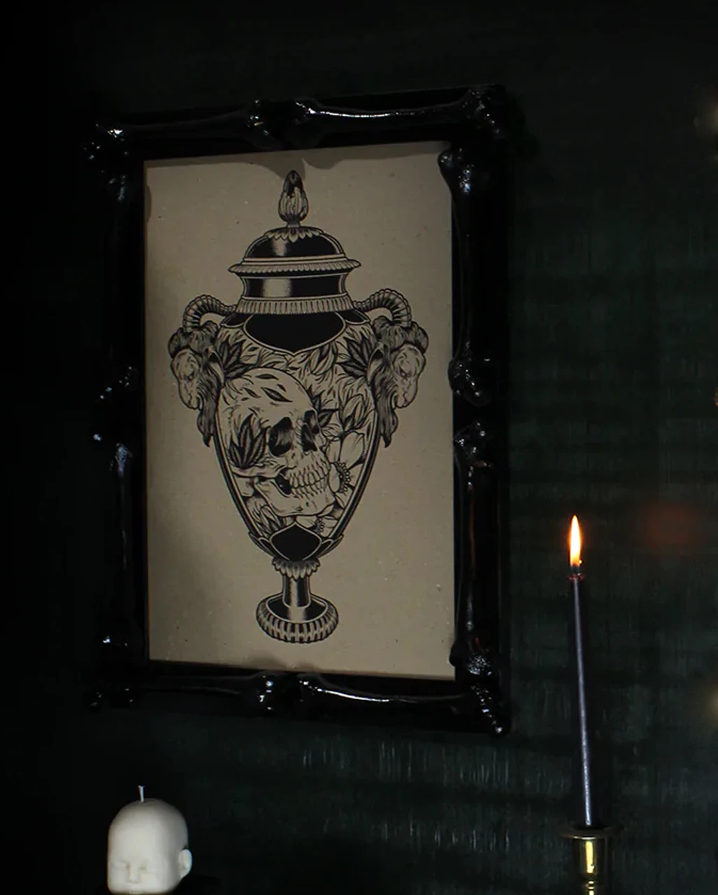 Verwandle dein Zimmer in eine düstere Gruft, und dekoriere mit unserem mystischen Gothic Bilderrahmen mit Knochen. Unser schwarzer Knochen-Bilderrahmen im A4-Format ist nicht nur gruselig designt, sondern auch für eine Vielzahl von stimmungsvollen Bildern geeignet. Völlig egal, ob du deine Fotos, Zeichnungen oder Gemälde einrahmen möchtest: Unser schwarzer Knochen Bilderrahmen im A4-Format setzt jedes Bild perfekt in Szene. Das Bild lässt sich zudem im Hoch- oder Querformat präsentieren. So kannst du noch flexibler sein. Übrigens ist das Gothic Wohnaccessoire auch eine super Idee zum Verschenken. Warte nicht länger, und krall dir diesen einzigartigen Knochen Bilderrahmen!