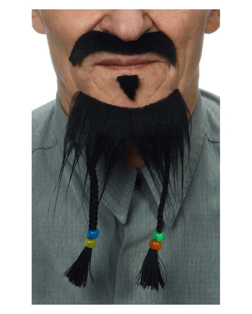 Das schwarze 3-teilige Bart Set besteht aus Ober- und Unterlippenbart sowie einem Kinnbart. Am Kinnbart befinden sich zwei geflochtene Zöpfe, an deren Ende je zwei bunte Perlen festgemacht sind. Alle Bärte lassen sich ganz einfach mit der hinten angebrachten medizinischen Pflasterfolie auf die Haut kleben. Die im Allgemeinen sehr gut verträgliche Pflasterfolie sorgt bei jedem Bart für einen guten Halt. Die Bärte sind aus weichem und sehr dichten Kunsthaar hergestellt und lassen sich immer wiederverwenden mithilfe von doppelseitigem Pflaster oder Mastix Hautkleber klein. Jeder Bart kann beliebig mit Wasser oder Haarwachs umgestylt und mit einer Schere zugeschnitten werden. Bestell dir jetzt das schicke schwarze 3-teilige Bart Set zum Aufkleben.