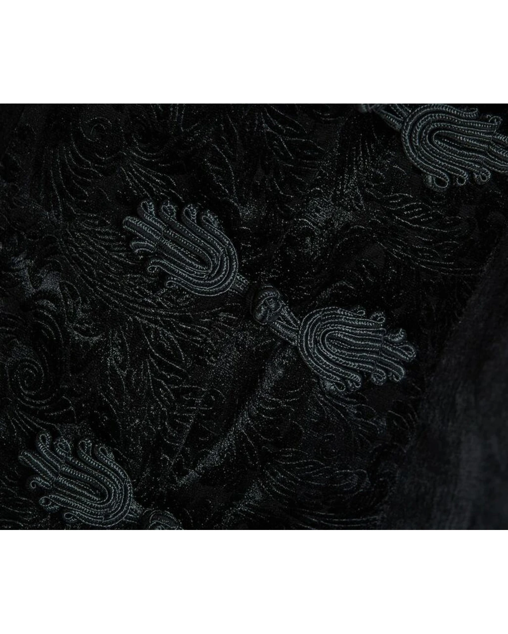 Bestelle dir jetzt einen schwarzen, hochwertigen Frach im viktorianischem Gothic Stil. Das Damenjackett ist aus luxuriös wirkendem Samtstoff gearbeitet, mit einer seidenweichen Oberfläche. Ein florales Stickmuster und eine extravagante Borte, Ärmel und Kragen sorgen für Aufmerksamkeit.