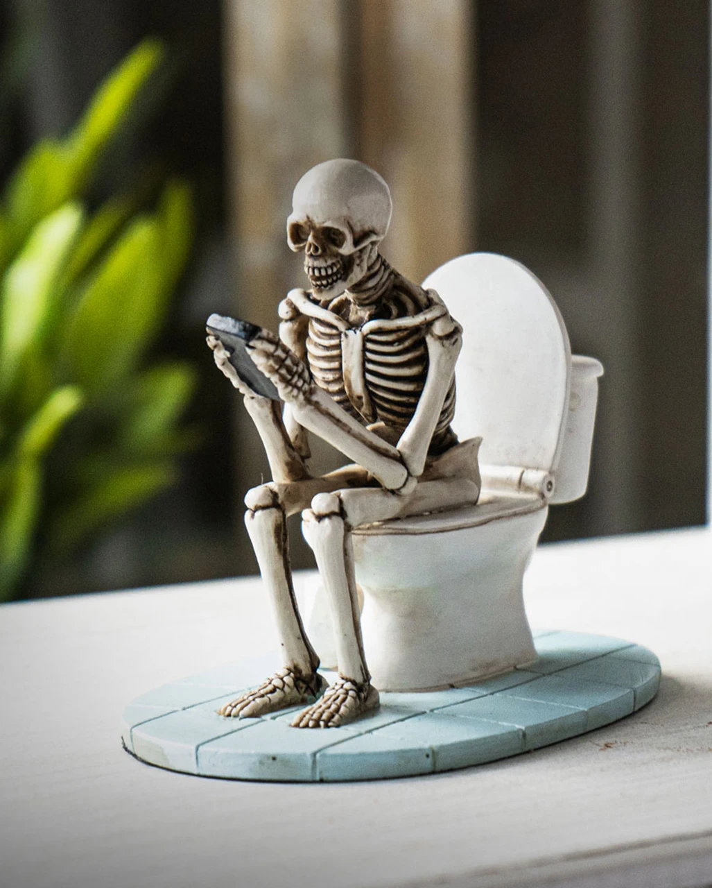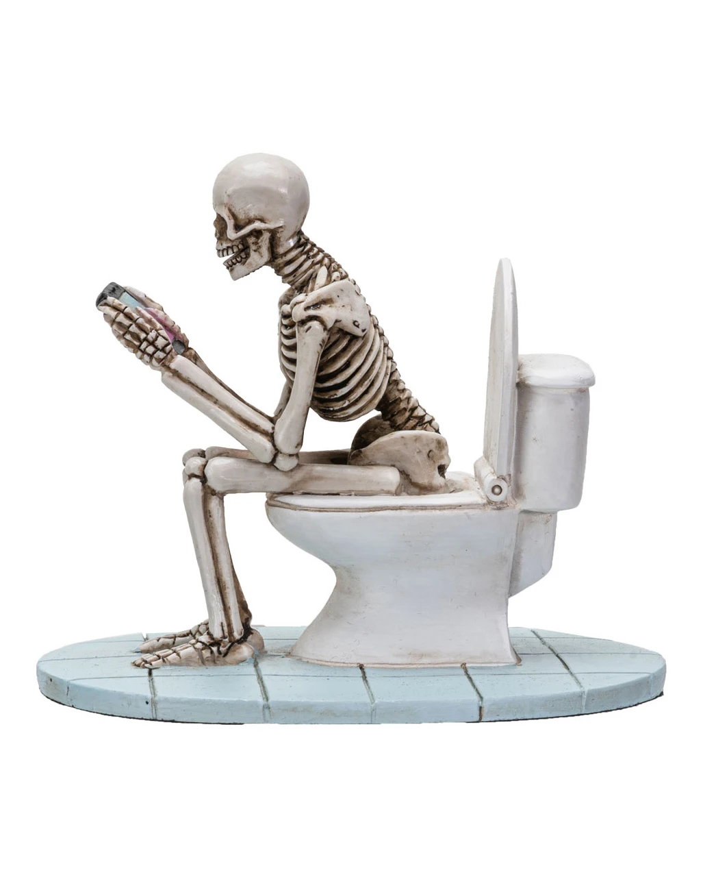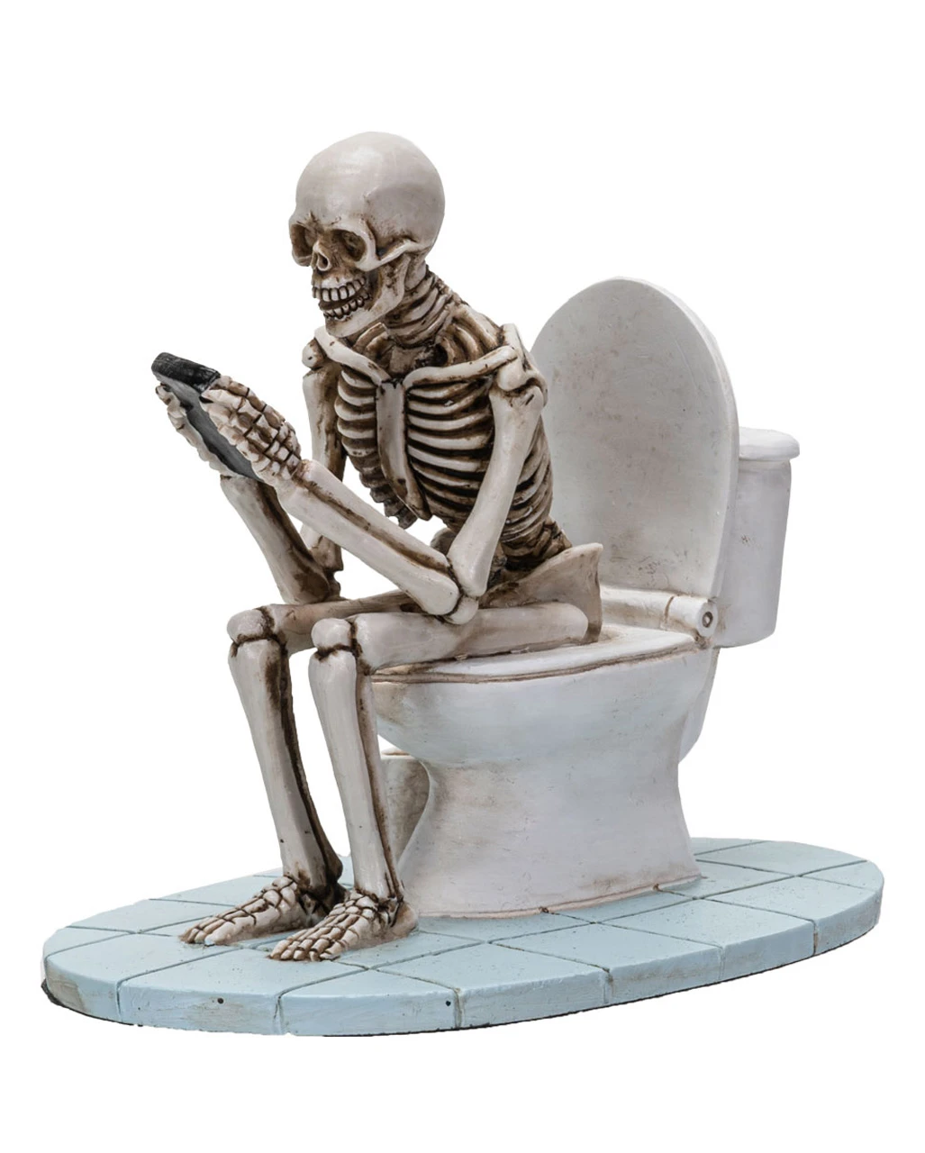 Das Skelett auf der Toilettenschüssel ist eine witzige Deko Figur mit wichtiger Botschaft. Du hast sicher auch schon mal eine längere Sitzung auf dem WC mit dem Smartphone verbracht. Pass auf, dass du über das Surfen im Internet und Herumdaddeln nicht die Zeit vergisst. Sonst geht es dir wie unserem knochigen Freund, der mal wieder nicht wusste, wann Schluss sein muss. Das Skelett auf der Kloschüssel ist das Ergebnis seiner ewigen Handy-Sucht. Immerhin dient er euch jetzt noch als witzige Dekoration.