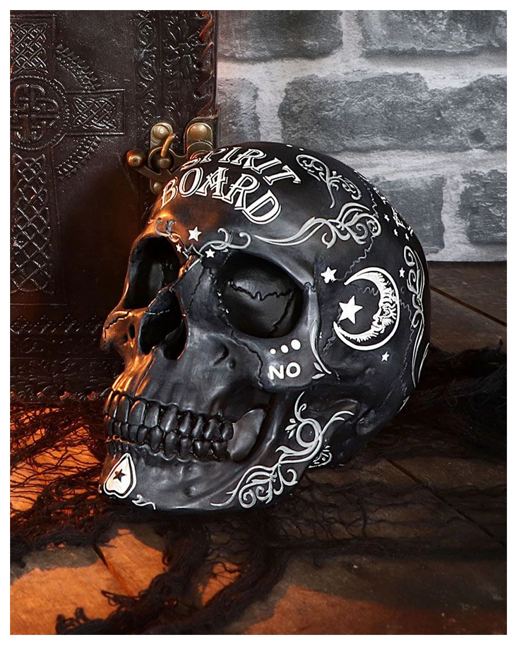 Der Spirit Board Ouija Totenkopf ist ein Deko Accessoire, der Gothic Fans und Liebhaber mystischer Dekofiguren das dunkle Herz aufgehen lässt. Damit verleihst du deiner Wohnung eine magisch-spirituelle Atmosphäre. Hast du Fragen, die du von übernatürlichen Kräften beantwortet haben willst, dann setze dich mit dem Geist unseres magischen Schädels in Verbindung. Wenn deine tiefschwarze Seele es wert ist, wird er dir antworten. Ansonsten erfreue dich einfach am Anblick des genialen Deko Artikels.