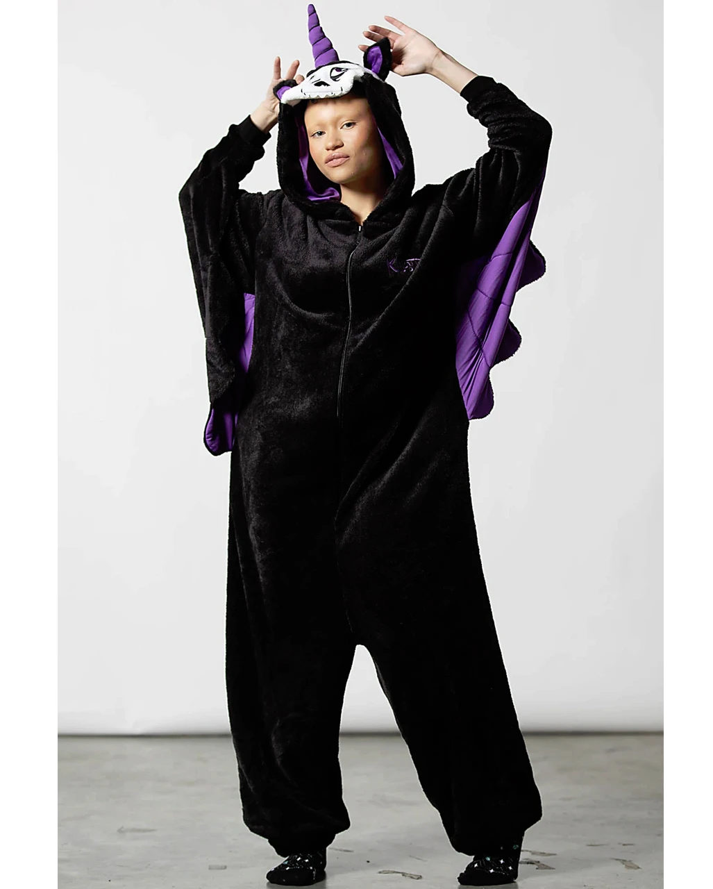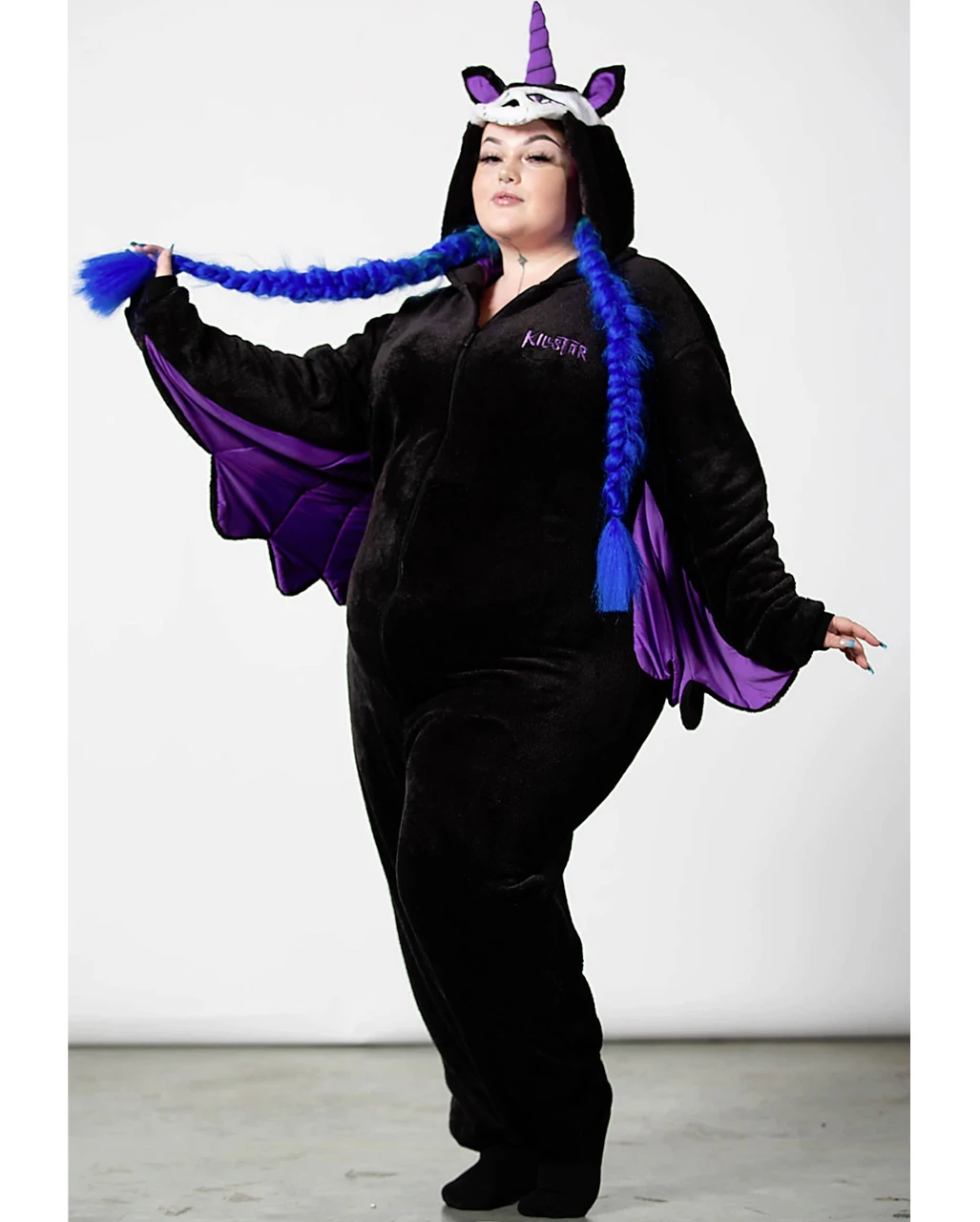Genieße den extremen Tragekomfort des Unicorn Onesie mit Kapuze KILLSTAR und werde zu dem Wesen, das du bist. Der schwarze Jumpsuit ist aus superweichem Plüsch und hat einen durchgehenden Reißverschluss, der sich leicht bedienen lässt, sowie süße Flügel und eine Kapuze mit Einhorndetails und gesticktem KILLSTAR-Logo. Dieser Gothic Overall ist wirklich perfekte Teil, um es sich in der Gruft gemütlich zu machen.