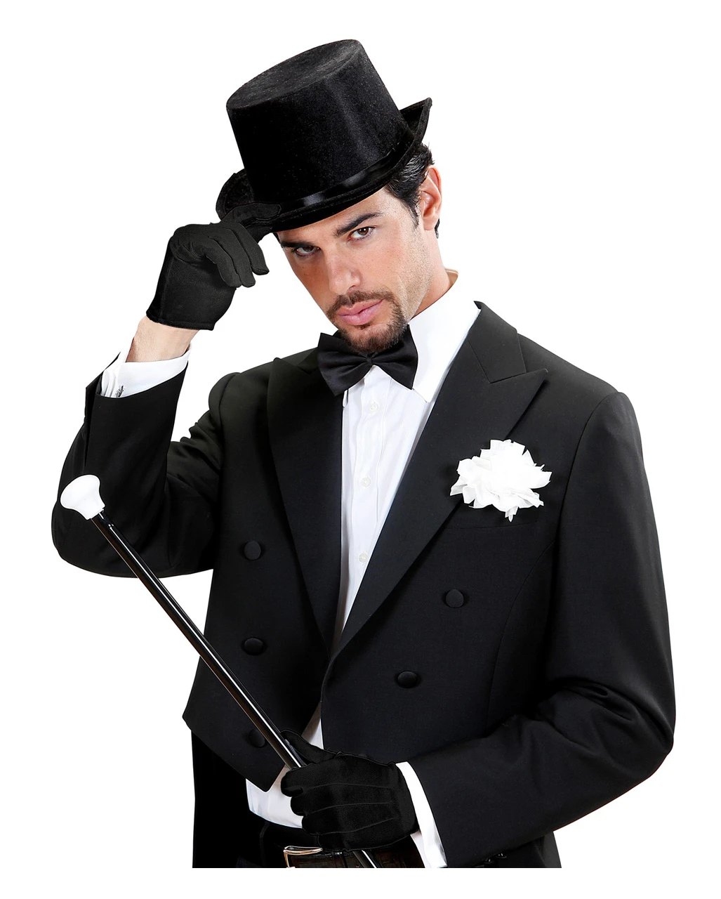 Universelle Handschuhe für Kostüme werten so manches Karnevalskostüm auf. Die schwarzen, schlichten Stoffhandschuhe passen zum Butler genauso wie zum Zauberer und Harlekin.