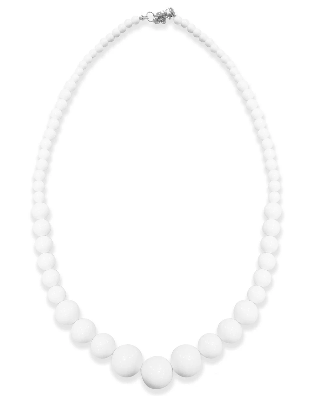Die modische weiße Kunststoff Perlenkette schmückt den Hals jeder Frau um damit an Fasching zu Karneval und Halloween so hübsch zu sein wie Audrey Hepurn. Die edle weiße Halskette ist ein Modeschmuck aus Kunststoff mit dickeren Perlen in der Mitte, die zum Verschluss hin klein auslaufen.