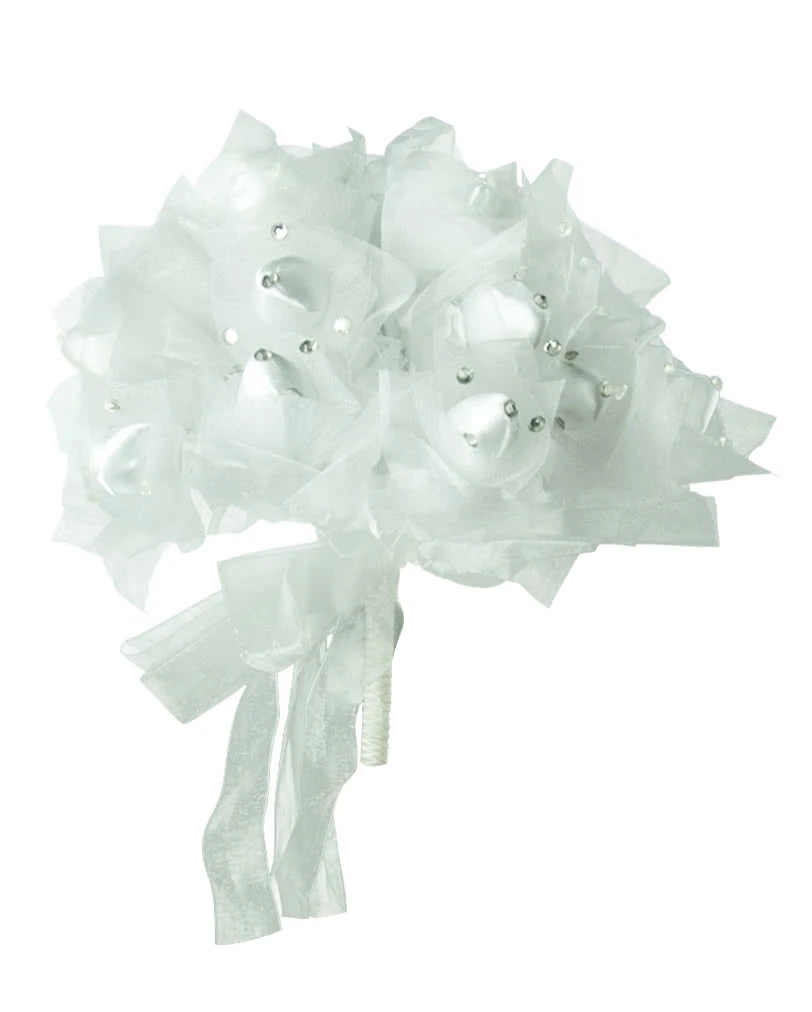 Der weiße Brautstrauß besteht aus vielen kleinen Blumen, die mit Glitzersteinen verziert sind und deren Stile aus Draht besteht, damit sie nach eigenen Wünschen drapiert werden können. Unter den Blumen ist eine Schleife mit etwa 42 cm langen Bändern befestigt, die herunter hängen. Der weiße Brautstrauß kann zu einer traditionellen Hochzeit zusammen mit der Weiße Tauben Girlande und den Weiße Premium Luftballons 50 St genutzt werden.