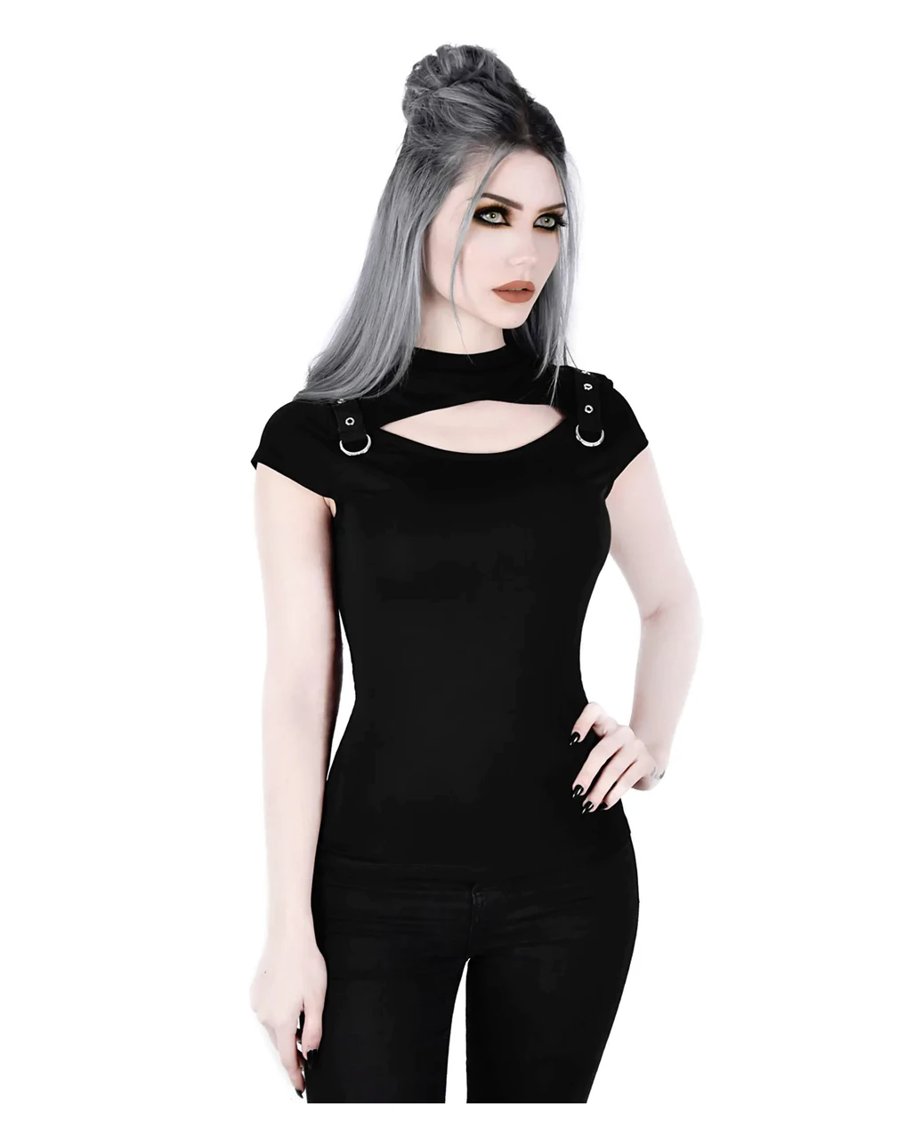 Mit dem Xara Keyhole Top KILLSTAR wirst zum Blickfang für alle, die dir und deinem düsteren Charme erlegen sind. Mit dem Gothic Top mit raffinierten Riemen Akzenten komplettierst du dich und deine Looks auf dunkle Weise. Ganz passend zu deinem alternativen Modestil, der das Charisma deiner besonderen Persönlichkeit ausmacht. Das Gothic Top ist vielseitig wie du und trägt sich perfekt von der Abenddämmerung bis zum Morgengrauen! Kombiniere es mit Röcken, Hosen oder schwarzen Leggings.