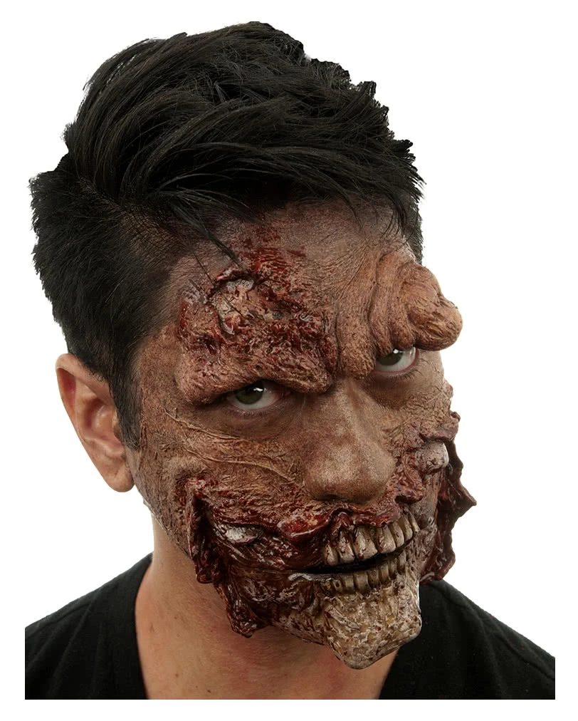 Mit der schauerlichen Zerfressener Kiefer Zombie Applikation kannst du dir selbst ein professionell aussehendes Zombie Make-up im Hollywood-Stil schminken. Der bis auf die Knochen brutal zerfressene Mund und die grausige Platzwunde sowie der schauerliche Beulenauswuchs über deinen Augen lässt dein Gesicht geradezu monströs, aber auch spektakulär aussehen.