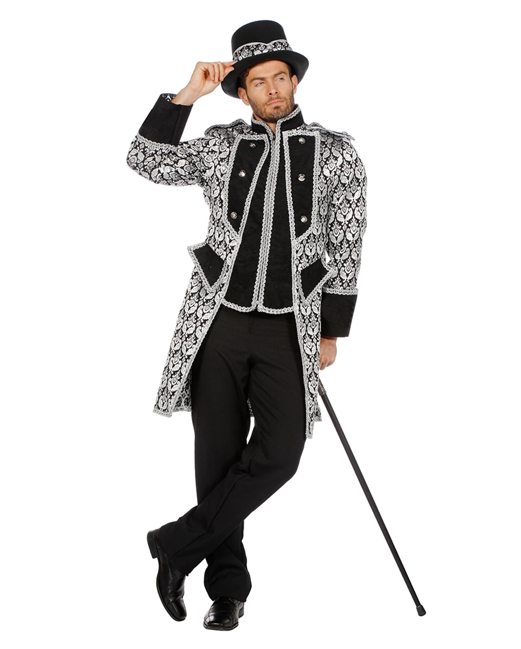 Der Zirkus Herren Dompteurs Frack besticht durch seine edle Optik. Die schwarz-silberne, gemusterte Farbgebung des Faschings-Fracks sorgt für einen eleganten Look, während der weite Schnitt samt militärischem Kragen ein unfiformhaftes Aussehen erzeugt, welches durch die Knopfreihen und Taschen noch verstärkt wird. Epauletten schmücken dein Faschings-Kostümaccessoire zusätzlich. Dazu empfehlen wir den Schwarzer Zylinder satiniert – Economy und den Wappenknauf Gehstock.
